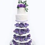 Красивый свадебный торт с фиолетовыми розами и капкейками