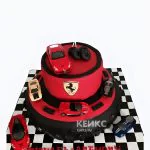 Гоночный торт в стиле Ferrari – это взрыв страсти и скорости! Два яруса покрыты гладкой мастикой алого цвета, словно капот спорткара. На нижнем ярусе – динамичная фотопечать с силуэтами гоночных машин, мчащихся по трассе. Верхний ярус украшает узнаваемая эмблема Ferrari – вздыбленный жеребец на ярко-желтом фоне. Четкие линии, блестящие детали и смелые контрасты создают ощущение мощности и драйва. Этот торт словно застывший момент гонки – энергичный, стильный и полный адреналина!