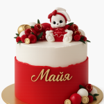 Красно-белый торт с ягодами и зайцем