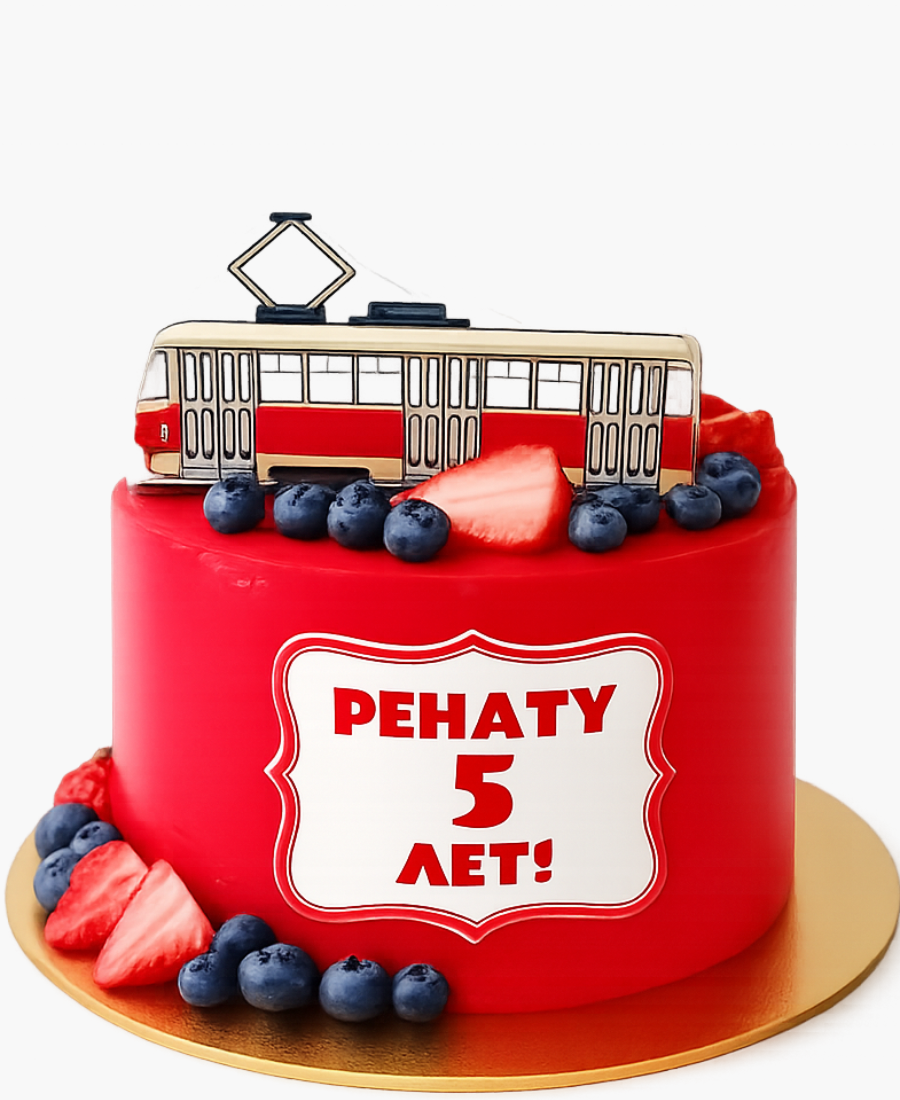 Красный торт на 5 лет с топпером трамвая