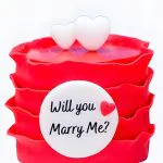 Яркий круглый торт в насыщенном красном цвете, украшенный нежными белыми сердечками. Глянцевая мастика придает торту праздничный блеск, а фотопечать с романтичными надписями добавляет индивидуальности. Сочетание алого и белого создает эффектный контраст, наполняя торт теплом и любовью. Идеально передает атмосферу сватовства — трогательного и волнительного момента.