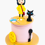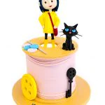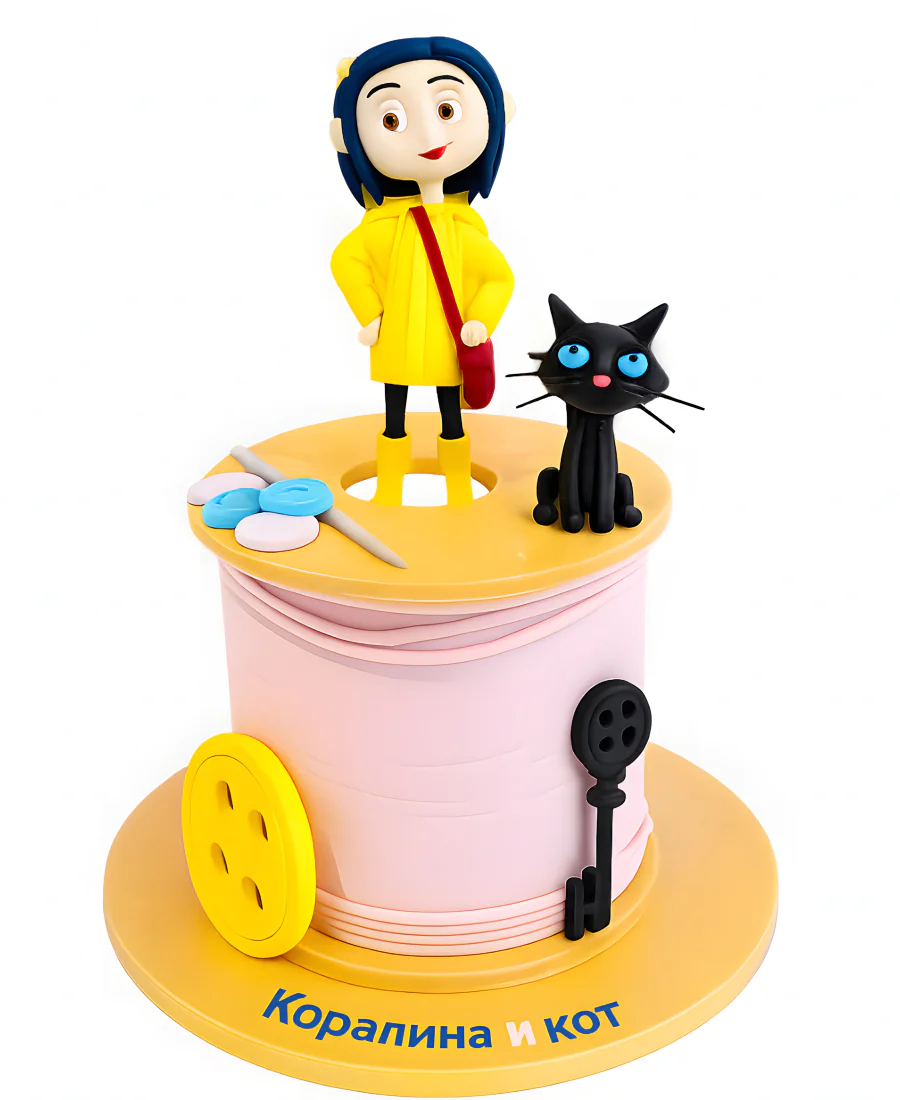 Креативный торт в виде мотка ниток с пуговицами и Коралиной