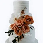 Этот свадебный торт — воплощение нежности и элегантности. Три яруса с рифленой текстурой создают ощущение воздушности, словно облако, покрытое тончайшим кремом. Белоснежные орхидеи и розы, искусно расположенные по торту, добавляют нотку романтики и природной гармонии. Мягкие складки и плавные линии декора напоминают кружево, придавая торту изысканный и торжественный вид. Сдержанная цветовая гамма подчеркивает чистоту и благородство момента.