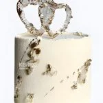 Нежный свадебный торт в пастельных тонах с романтичными серебряными акцентами. Гладкая кремовая поверхность украшена изящными сердечками, которые переливаются на свету. Мягкие складки и деликатные жемчужные бусины создают ощущение воздушности и праздника. Сдержанная элегантность и лаконичность декора подчеркивают торжественность момента. Светлые оттенки розового и бежевого гармонично сочетаются с металлическим блеском, добавляя торту особый шарм.