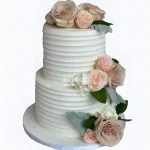 Этот элегантный двухъярусный торт выглядит как воплощение нежности. Белоснежные ярусы украшены тонкими вертикальными полосками, создающими эффект лёгкой драпировки. Верхний ярус венчает композиция из пышных кремовых роз, которые кажутся только что сорванными с весеннего куста. Переливы белого и кремового оттенков придают торту воздушность, а аккуратные зелёные листья среди цветов добавляют свежести. Торт выглядит одновременно роскошно и утончённо, будто создан для особенного момента.
