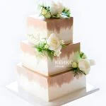 Квадратный свадебный торт с коричневыми мазками и белыми розами