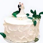 Нежный свадебный торт в пастельных тонах создает атмосферу трогательной романтики. Белоснежная кремовая поверхность украшена изящными цветами нежно-розового и персикового оттенков. Золотистые листочки добавляют торжественности композиции. Миниатюрная фигурка молодоженов на вершине завершает эту трогательную сцену. Лаконичная круглая форма подчеркивает элегантность и гармонию всего образа.