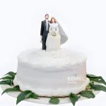 Нежный свадебный торт в пастельных тонах с изящными кремовыми рюшами и сахарными цветами. Фигурки молодожёнов в центре создают трогательную композицию, а перламутровые блёстки добавляют торжественности. Круглая форма и воздушная текстура крема подчёркивают романтичность момента.