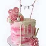 Малиновый торт девочке на 11 лет с живыми цветами и леденцами