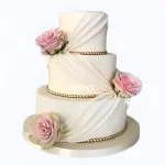 Этот свадебный торт словно соткан из нежных розовых лепестков. Три яруса, покрытые гладкой мастикой, украшены объемными розами, которые будто только что расцвели. Переливы персикового и кремового оттенков создают ощущение тепла и нежности. Каждый цветок тщательно проработан, добавляя торту изысканности и романтики. Легкие золотые акценты подчеркивают торжественность момента, делая этот торт настоящим украшением свадьбы.