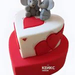 Нежный свадебный торт в форме двух переплетенных сердец создает трогательную атмосферу. Белоснежная мастика украшена изящными золотыми узорами, напоминающими кружево. На вершине — очаровательные фигурки слонов в свадебных нарядах, символизирующие верность и вечную любовь. Розовые акценты в декоре добавляют торжественности и романтики. Композиция выглядит гармонично и элегантно, передавая светлые чувства этого особенного дня.