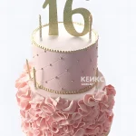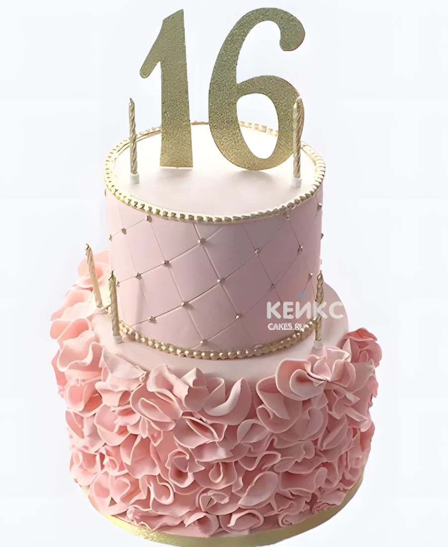 Милый торт на 16 лет девочке в два яруса с рюшами и цифрой