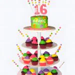 Нежный голубой торт украшен золотистыми акцентами и воздушными облаками. По бокам расположились миниатюрные капкейки в тонкой цветовой гамме. Серебряная надпись «16» переливается на основном фоне, создавая праздничное настроение. Композиция дополнена стилизованными звездами, которые добавляют торту современный и одновременно сказочный вид.