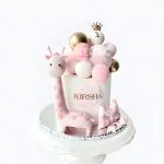 Этот очаровательный торт создан для самого первого праздника в жизни малышки. Нежный розовый фон украшен золотыми звездами и воздушными шарами, а главным героем композиции стал улыбающийся жираф из мастики. Торт выглядит как страница из детской книжки — яркий, радостный и полный волшебства. Сочетание пастельных оттенков и золотых акцентов придает торту праздничный и трогательный вид, идеально подходящий для памятного события.