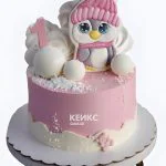 Этот торт словно страница из детской книжки — яркий, добрый и полный очарования. На белоснежном креме изображен улыбающийся пингвин в синем шарфике, окруженный воздушными безе и разноцветными кондитерскими шариками. Синие и голубые акценты создают зимнее настроение, а нежные пастельные оттенки добавляют торту мягкости. Простая круглая форма подчеркивает милую графичность декора, делая торт похожим на иллюстрацию.
