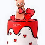 Яркий и игривый торт в мультяшном стиле создан для Дня всех влюбленных. Основа украшена нежными розовыми и красными оттенками, а сверху — забавные фигурки влюбленных персонажей с большими глазами и милыми улыбками. Сердечки, блестки и плавные линии придают торту динамику и праздничное настроение. Такой торт сразу привлекает внимание и вызывает улыбку — он словно сошел с экрана доброго мультфильма.
