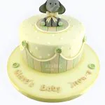Яркий круглый торт в солнечных желтых и свежих зеленых тонах. На поверхности застыли забавные фигурки: улыбающийся слон в шляпе, разноцветные шарики и звездочки. Мастика создает гладкую фактуру, а контрастные цветовые пятна наполняют композицию динамикой. Веселая детская тематика передает настроение праздника и радости.