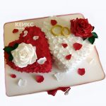 Необычный свадебный торт в виде сердца в красно-белом цвете с кольцами