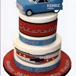 Этот торт — настоящее произведение искусства в синих тонах. Два яруса покрыты гладкой мастикой, создавая эффект идеальной поверхности. Верхний ярус украшен фотопечатью с логотипом Chevrolet, а нижний — стильными аппликациями, напоминающими элементы автомобиля. Голубая фигурка машины на вершине торта добавляет динамики и завершает композицию. Четкие линии и лаконичный дизайн делают его современным и стильным.