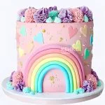 Нежный розовый торт с радугой и сердечками для девочки