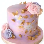 Нежный торт на 8 марта с золотыми бабочками и цветами