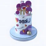 Нежный торт в пастельных тонах с розовыми и персиковыми оттенками. На боковой поверхности — изящные волны кремового цвета, создающие эффект мягких складок. Верх украшен стилизованными леденцами пастельных цветов и современной инстаграм-рамкой для фото. Сочетание геометрических элементов и плавных линий придает десерту современный и мечтательный вид.