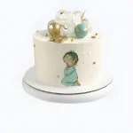Нежный круглый торт в пастельных тонах с трогательной фотопечатью. Воздушные облака из крема и золотистые акценты создают атмосферу нежности и чистоты. Светло-голубые и бежевые оттенки гармонично сочетаются, напоминая о первых моментах жизни. Милые детали в виде звездочек и бантиков добавляют торту особое очарование.