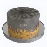 Этот торт — настоящее произведение искусства в холодных серых тонах. Его поверхность напоминает грубый бетон с тонкими прожилками и неровностями, создающими эффект фактурности. Яркий контраст — языки пламени из мастики, будто вырывающиеся из глубины торта. Огонь выполнен в насыщенных оранжевых и красных оттенках, добавляя динамики строгому дизайну. Минималистичный, но выразительный декор делает этот торт запоминающимся и современным.