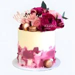 Нежный пастельный торт с тонкими переходами розовых и персиковых оттенков. Верх украшен живыми цветами – розами и пионами, которые создают ощущение свежести и легкости. Золотые макаруны добавляют торту элегантности и праздничного блеска. Гладкая кремовая поверхность с деликатными волнами подчеркивает изысканность декора. Этот торт словно окутан воздушностью и романтикой, идеально передавая атмосферу особенного дня.