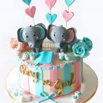 Нежный круглый торт в пастельных тонах создает атмосферу детской мечты. Голубые и белые полосы гармонично сочетаются с милыми аппликациями слонят. Объемные цветы из мастики добавляют торту воздушности и праздничного настроения. Каждый элемент композиции словно рассказывает трогательную историю, наполненную теплом и радостью.