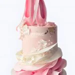 Нежный розовый торт, словно сошедший со страниц сказки, украшен изящными пуантами и цветочными композициями. Пастельные оттенки розового создают воздушную, почти акварельную атмосферу. Пуанты, аккуратно расположенные по бокам, добавляют торту балетной грации. Цветы из крема с тонкими переходами тонов напоминают весенний сад. Легкие золотистые акценты придают торту нотку праздничного шика. Этот торт — словно воплощение нежности и детской мечты.