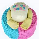 Яркий и необычный торт привлекает внимание контрастным дизайном. Половина десерта оформлена в нежных розовых тонах с воздушными рюшами, другая — в голубых с геометрическими узорами. Фигурка на вершине в виде забавного младенца дополняет игривую атмосферу праздника. Сочетание классической круглой формы и современного креативного подхода создает запоминающийся визуальный образ.