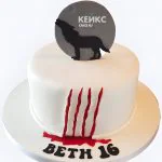 Забавный круглый торт с ярким персонажем — стилизованным волком в очках. Фигурка животного выполнена в мультяшном стиле с выразительной мимикой. Композицию дополняет юмористическая надпись, создавая игривое настроение. Сочетание белого фона с контрастными деталями делает торт запоминающимся и фотогеничным. Отличный вариант для неформального праздника.