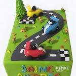 Прямоугольный торт гонки с машинками из мастики в зеленом цвете