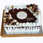 Прямоугольный торт в праздничном оформлении притягивает взгляд насыщенной шоколадной палитрой. Поверхность украшена изящными завитками из белого крема, создающими элегантный контраст. Золотистые акценты и декоративные элементы добавляют торжественности, а аккуратные бордюры по краям подчеркивают завершенность композиции. Такой десерт станет ярким центром праздничного стола, излучая атмосферу особенного события.