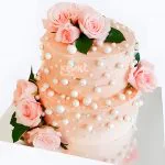 Пудровый свадебный торт с розами и крупными жемчужинами