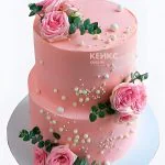 Пудровый свадебный торт с розовыми розами и жемчугом