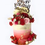 Пышный красный торт с живыми цветами и макаронс