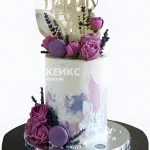 Пышный праздничный торт идеально подойдет для празднования пятидесятилетия женщины! Он украшен оригинальным дизайном и свежими цветами, такими как орхидеи и хризантемы. Верхняя часть торта покрыта кремом без мастики и золотой посыпкой, что придает ему роскошный и элегантный вид.