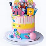 Радужный торт девочке на 11 лет с косметикой и леденцами