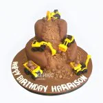 Разрезанный шоколадный торт с машинками