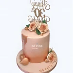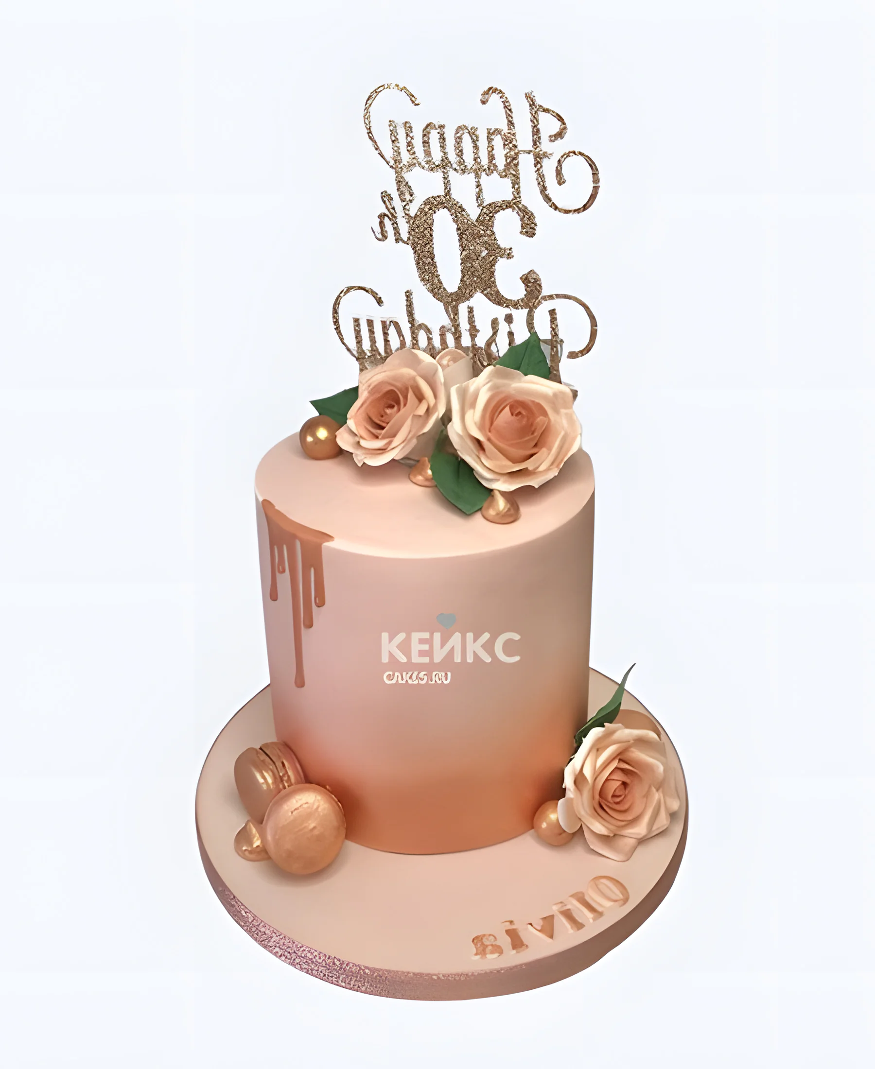 Розово золотистый торт женщине на 30 лет с цветами и макарунс