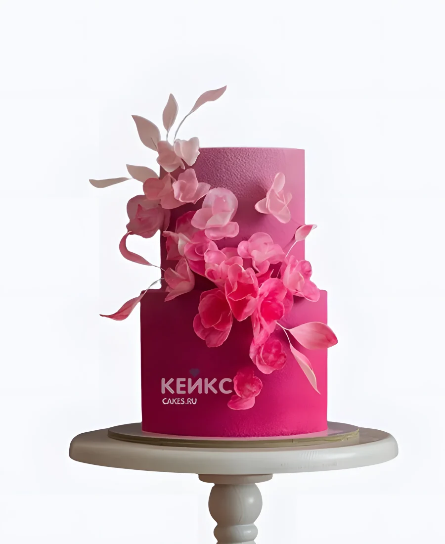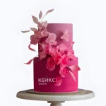 Розовый двухъярусный велюровый торт с цветами