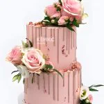 Нежный свадебный торт в пастельных тонах. Два яруса украшены воздушными розами из крема, которые словно парят над поверхностью. Элегантные подтёки розового цвета создают эффект струящегося шёлка. Романтичная композиция дополнена живыми цветами, гармонично перекликающимися с кремовыми бутонами. Лёгкость и изящество в каждой детали.