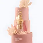 Розовый свадебный торт с белыми цветами и золотой фольгой
