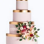 Нежный свадебный торт в пастельно-розовых тонах с золотыми акцентами. Четыре круглых яруса украшены воздушными цветочными композициями, напоминающими свадебный букет. Тонкие золотые линии подчеркивают изящество силуэта, создавая эффект драгоценного украшения. Мягкие складки крема добавляют торту легкость и романтичность. Цветочные элементы расположены асимметрично, придавая композиции динамику и свежесть. Золотое обрамление по краям ярусов перекликается с лепестками, усиливая ощущение праздника.