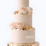 Розовый свадебный торт с розами золотыми листочками и обрамлением
