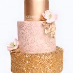 Розовый свадебный торт с узорами цветами и золотыми пайетками