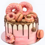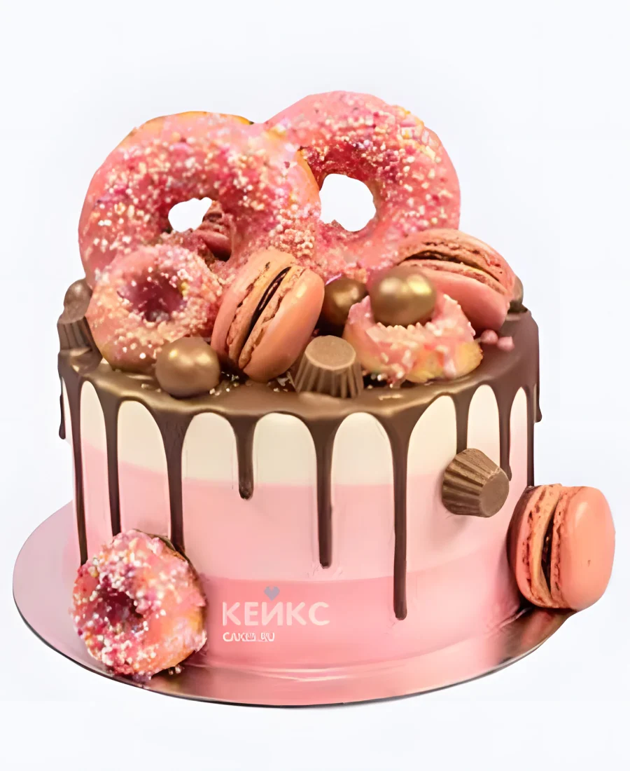 Розовый торт девочке с пончиками и макарунами