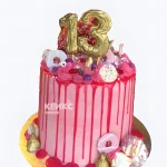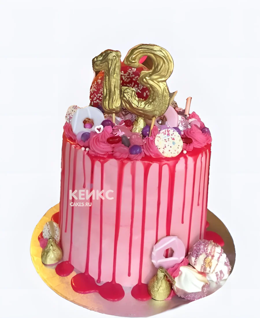 Розовый торт на 13 лет с подтеками и сладостями